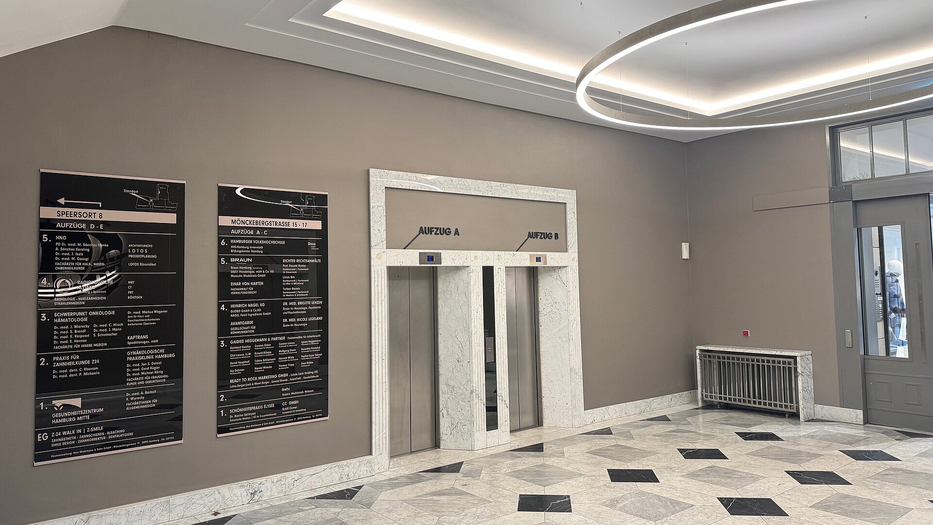 Die zentrale Eingangs- und Durchgangshalle am Eingang Mönckebergstraße 17 präsentiert sich ab sofort in einem frischen, zeitgemäßen Erscheinungsbild. Ein hochwertiger neuer Farbanstrich, moderne Orientierungstafeln zu den Mietern und eine vollständig überarbeitete Beleuchtung setzen klare Akzente.